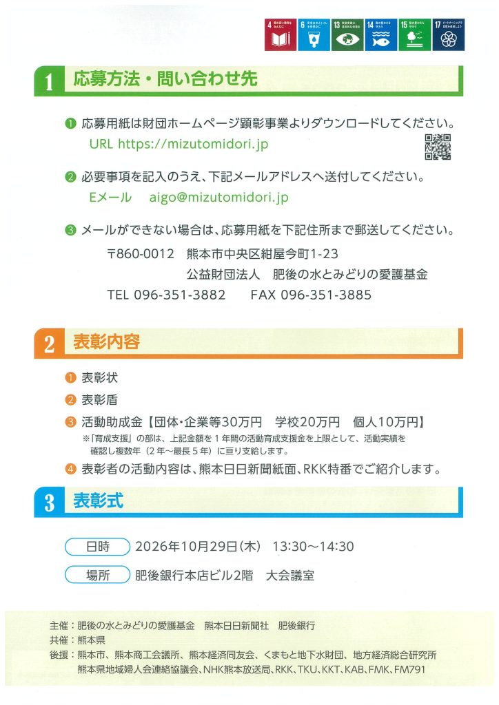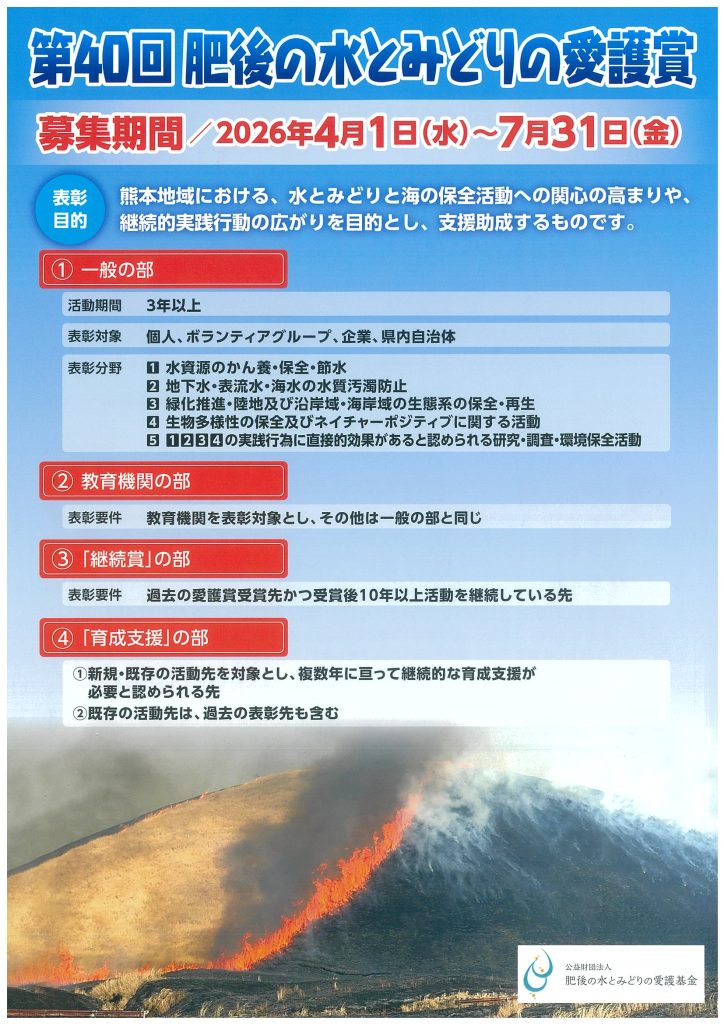 第40回 『肥後の水とみどりの愛護賞』を募集します! 第40回 『肥後の水とみどりの愛護賞』を募集します。たくさんのご応募、ご推薦をお待ちしております。「育成支援の部」への応募につきましては、応募用紙が異なりますので事前に事務局にご相談くださいますようお願いいたします。 ※応募用紙はこちらです。 ouboyousiダウンロード 一覧へ戻る